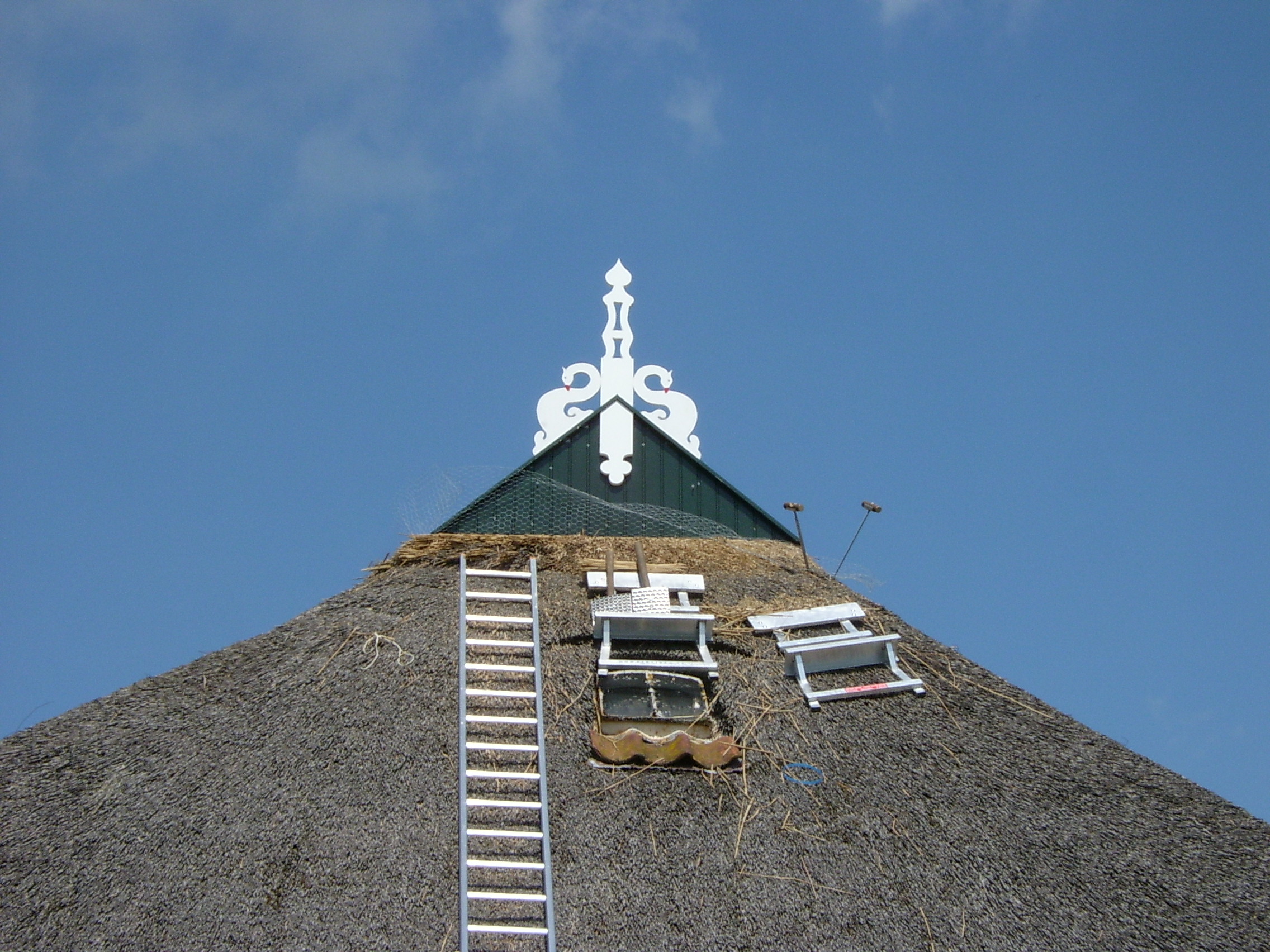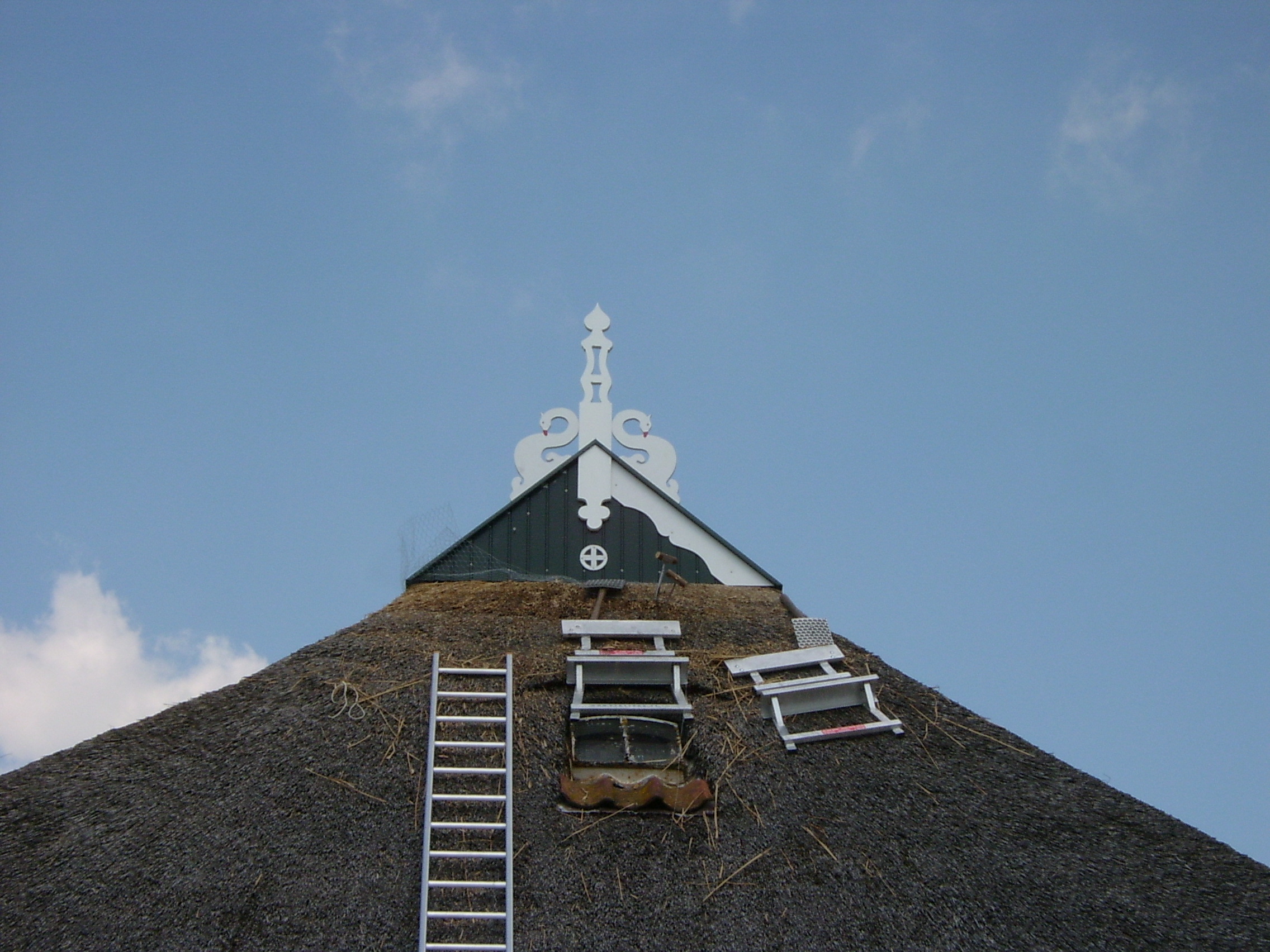 Waarom kunstof uileborden. Op het Friese uilebord zitten twee zwanen en een makelaar (versierde balk)